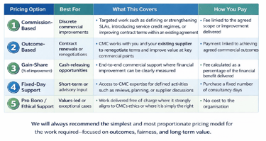 At CMC, we believe commercial expertise should be accessible to all organisations. Our pricing is designed to flex to the work required, the outcomes sought, and the circumstances of our clients. Each case is unique, that means is price is individualised, but this does mean it needs ot be cost prohibitive!