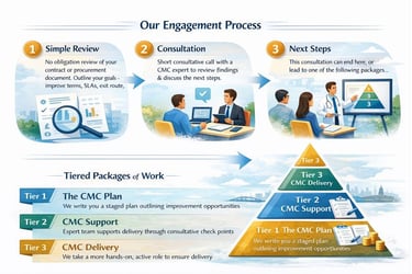 You receive a clear, no-obligation assessment of your contract or procurement scope, highlighting opportunities to improve commercial terms, strengthen SLAs, clarify exit options, and benchmark against industry standards