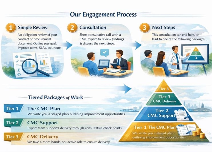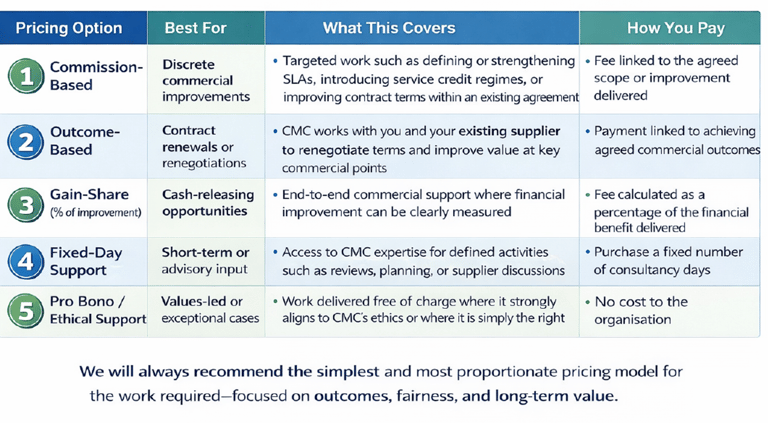 At CMC, we help organisations maximise the value, accountability, and operational impact of their technology contracts. Our services combine ethical business practice, commercial expertise, and operational insight to ensure technology arrangements work for you—not the supplier.
