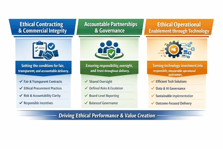 This three-pillar approach turns ethical intent into measurable outcomes, protecting trust, performance, and long-term value throughout delivery. ethics into how work is contracted, governed, and delivered.