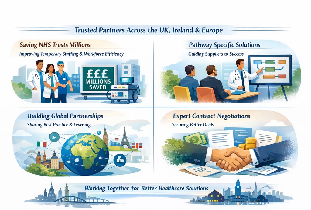With over 20 years experience we have partnered with national health systems and public and private organisations across the UK, Ireland and Europe to deliver measurable value. Our work has saved NHS trusts millions through improved workforce and supplier performance, pathway-led delivery, and strong commercial negotiation—driving better outcomes at scale.